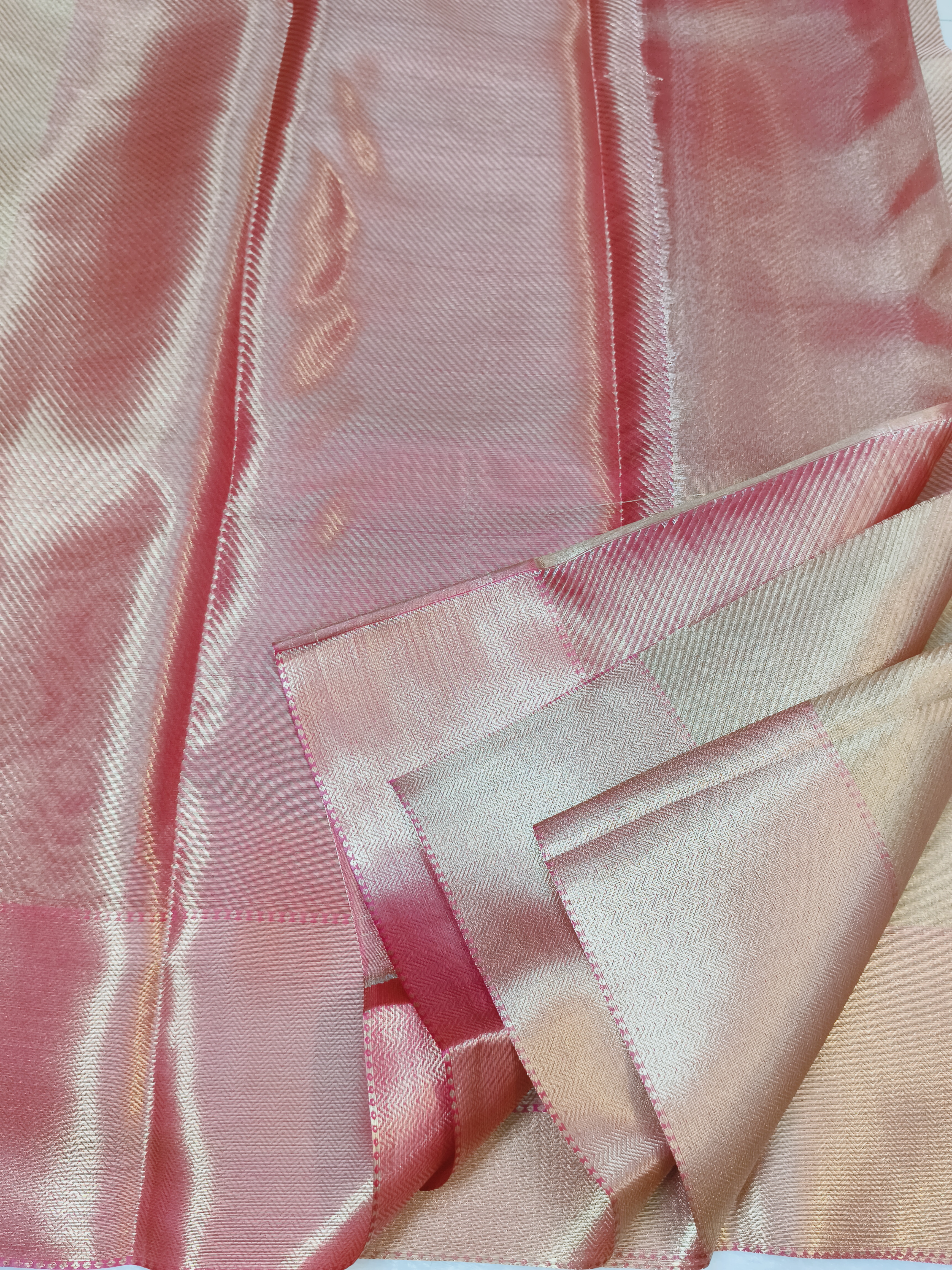 A graceful golden peach saree with a soft luminous finish and elegant pink border detailing. Its rich shine and refined drape give it a timeless festive look inspired by celebrity-style elegance.