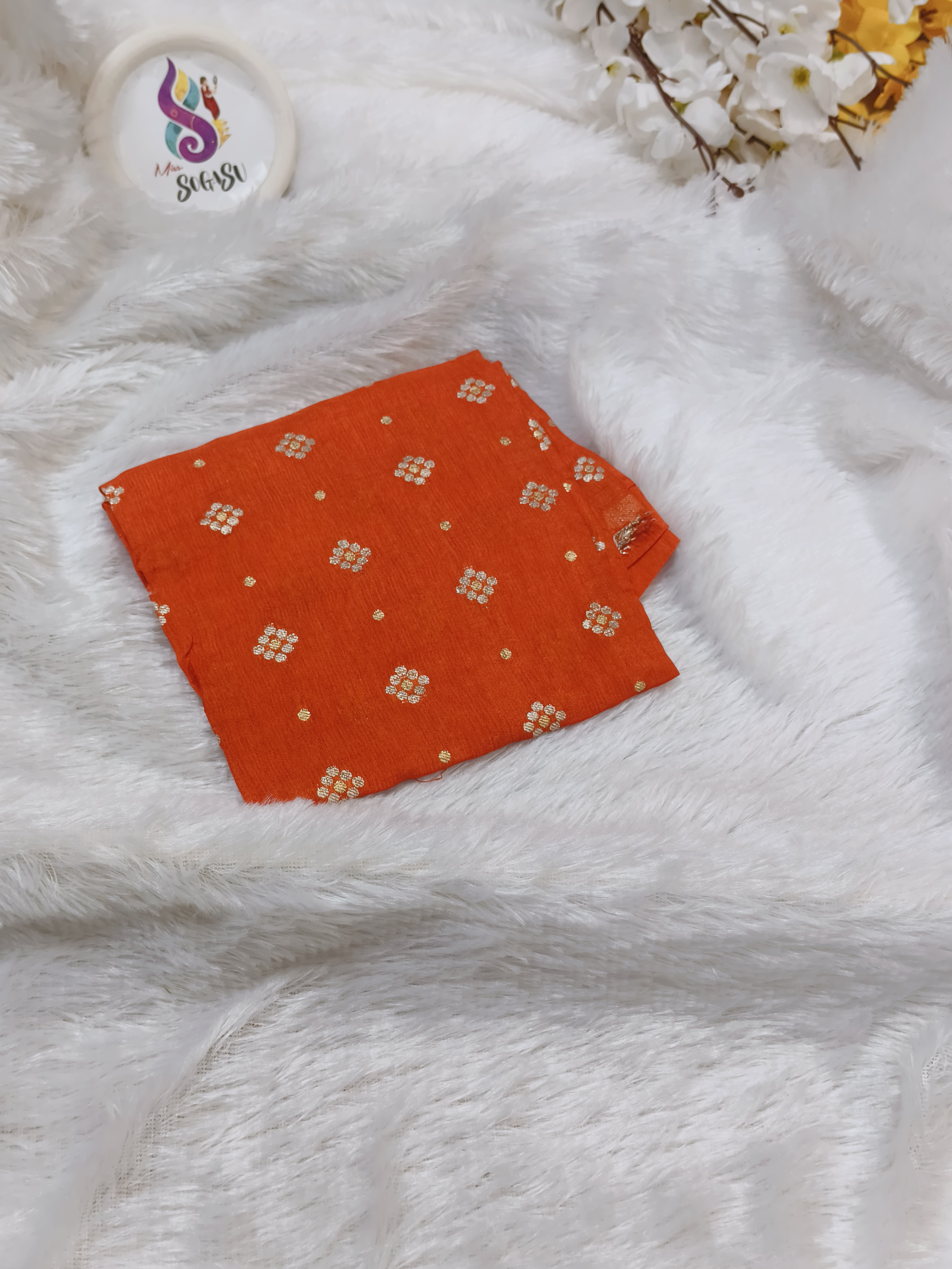 This orange georgette saree is designed for a clean, elegant look with minimal effort. The body features subtle gold butta motifs that add just enough detail without making it heavy. The highlight is the rich woven gold border, which gives the saree a festive finish.