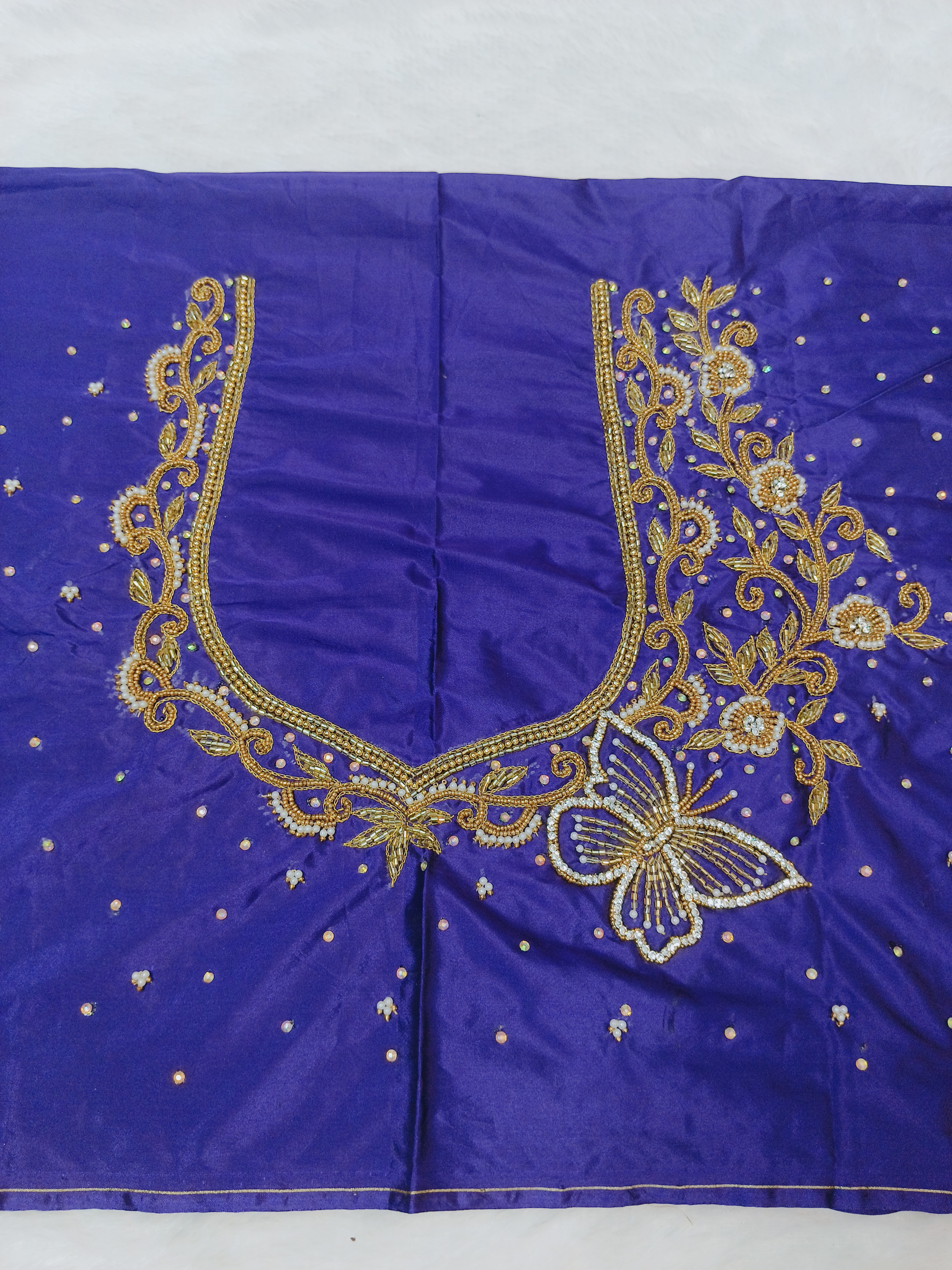 Royal purple blouse piece with heavy butterfly maggam embroidery and stone detailing.