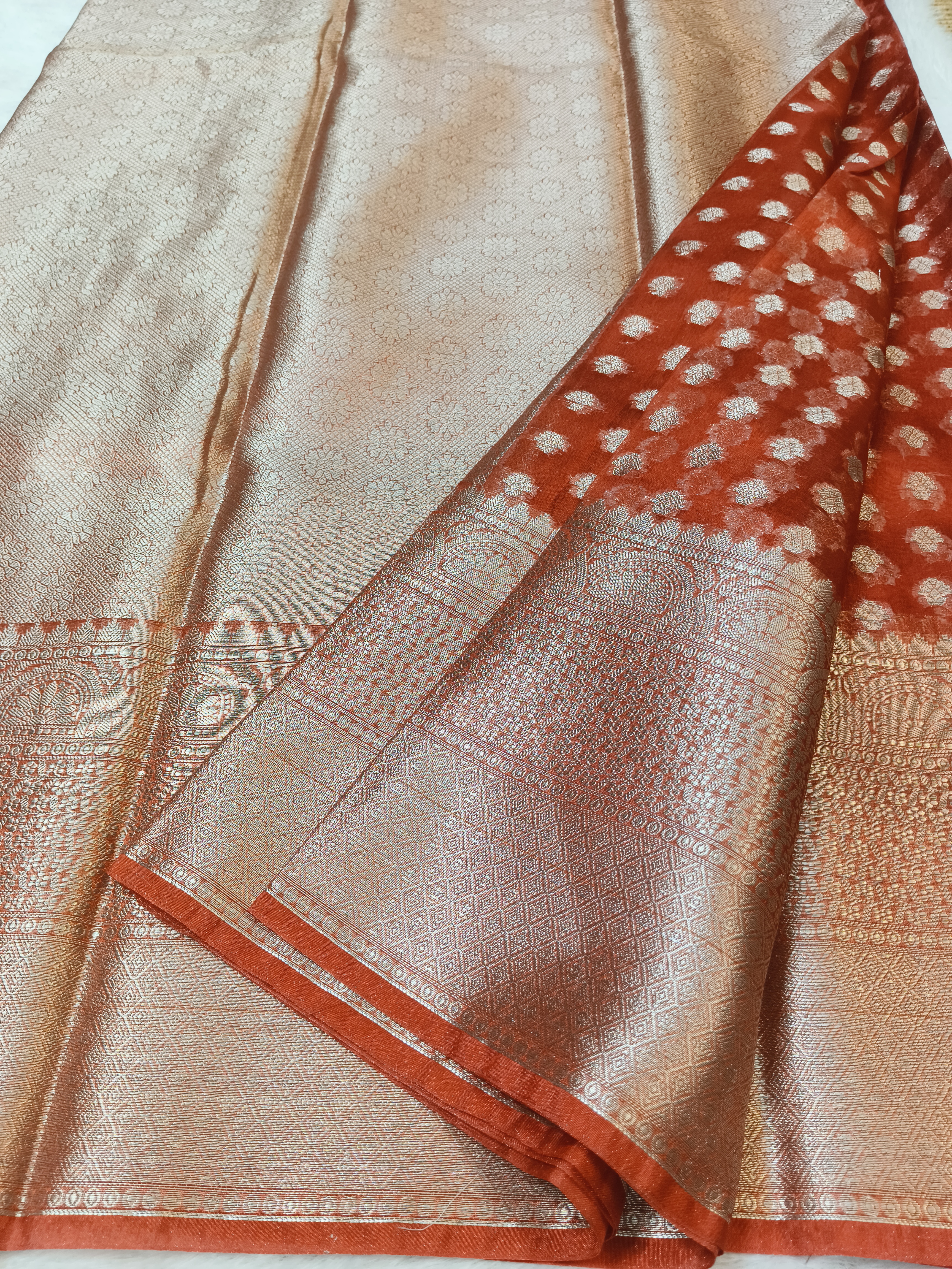 A striking red Banaras tissue saree crafted with intricate silver zari detailing across the body and a richly woven traditional border. The shimmering tissue texture gives it a lightweight yet grand festive appeal. Perfect for weddings, receptions, and special occasions where elegance needs to shine effortlessly.